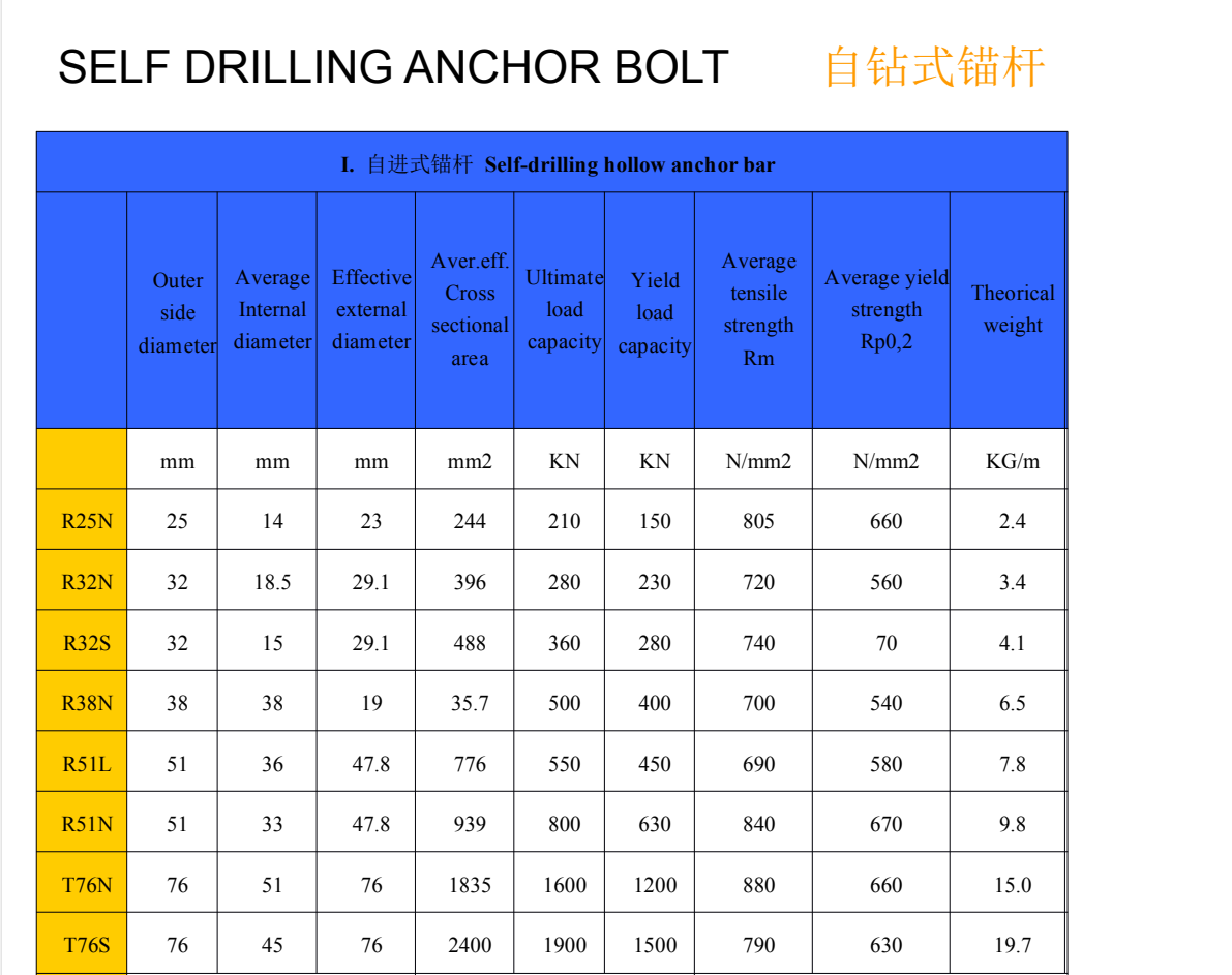 TAISHAN Self-drilling anchor embodies drilling, grouting and anchoring as a whole. Widely used as an efficient anchoring means, in tunnel presupport, slope, coast, mine, water conservancy projects, building foundation, roadbed reinforcement and geological diseases treatment such as landslip, crack, sinkage. It’s irreplaceable in narrow construction environment.