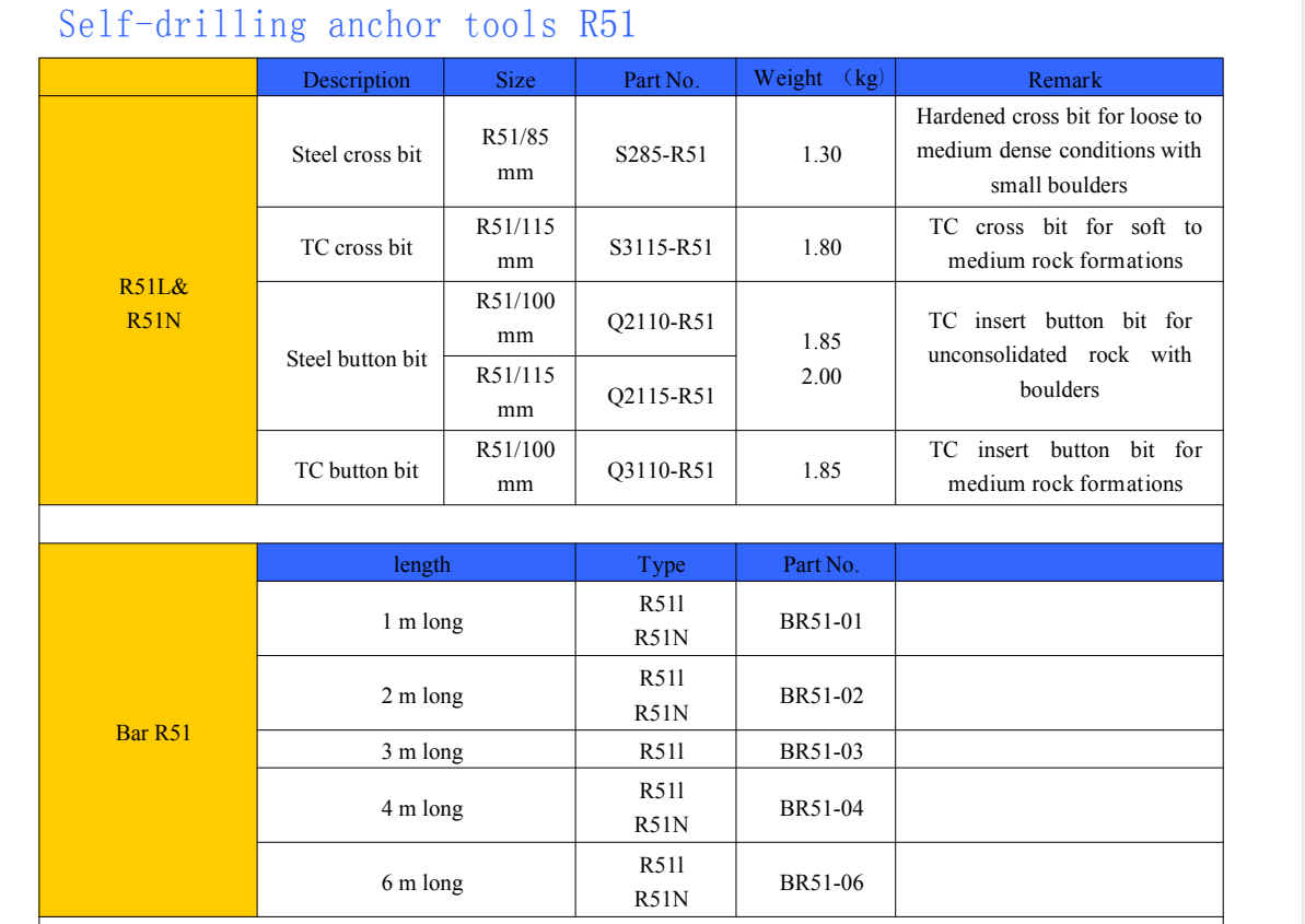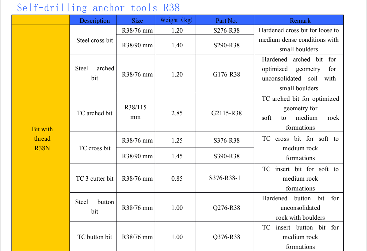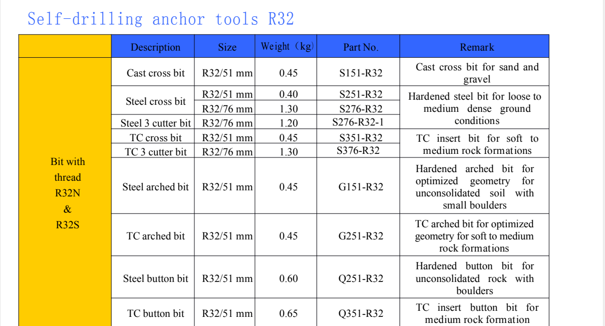Tungsten Carbide and Steel Cross, Button Bits (R25 x 42 mm, R32 x 51 mm, R38 x 76mm, R51 x 110mm etc) Anomalistic Cast Bits ( R32 x 75mm, R38 x 110mm etc) Three Aerofoil Cast Bits ( R38 x 110mm, R51 x 110mm etc)Tungsten Carbide and Steel Arched Cast Bits (R32 x 51 mm, R38 x 75mm, R51 x 110mm etc)