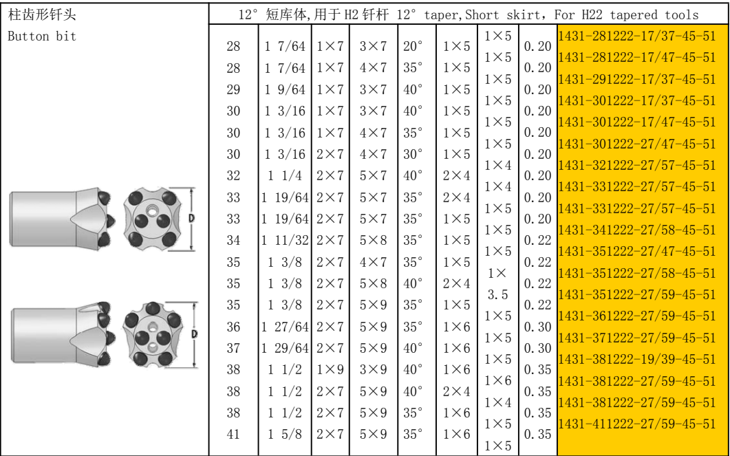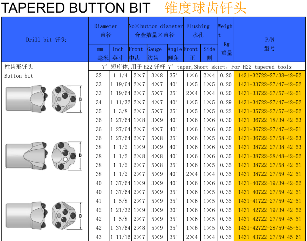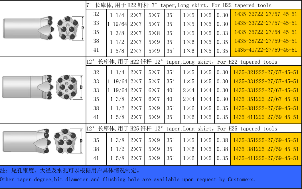tapered button bit we can produce 7°,11°,12°,the diameter of the drill bit we can provide 28mm---60mm , the button bit we can make three button--8 button