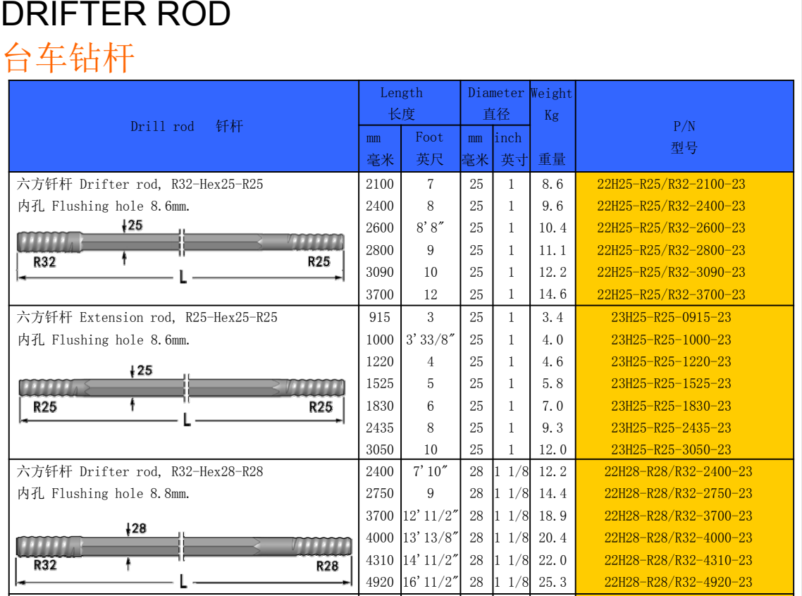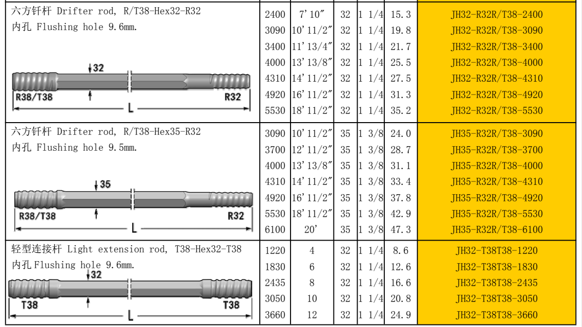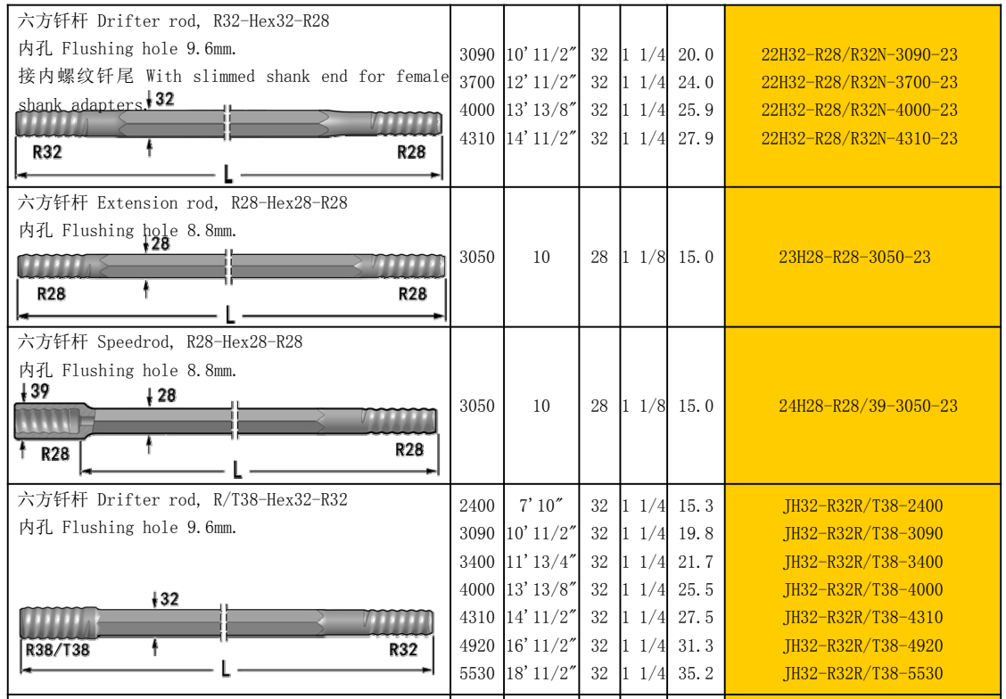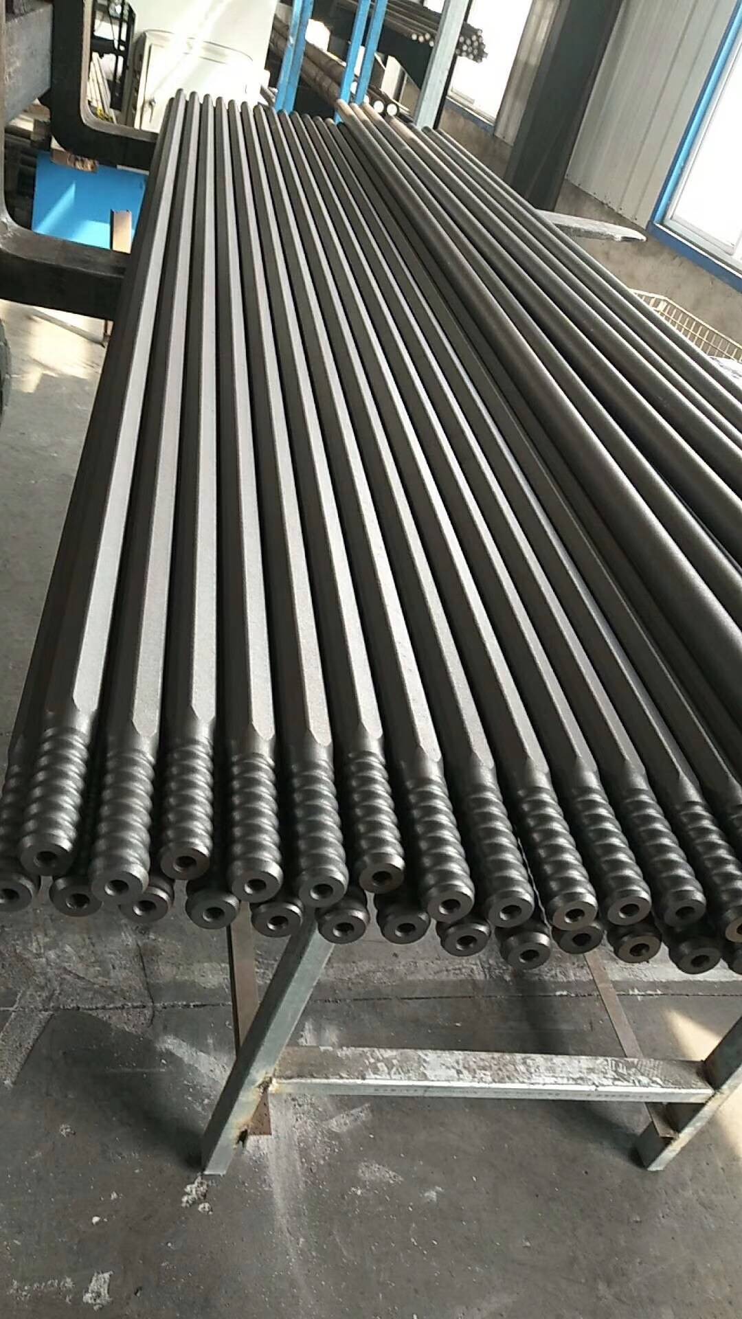 TAISHAN Drifter rods are made by hollow drill steels; there are two shapes of Drifter drill rods, round type and hexagonal type. This hollow hole are usually named flushing hole, used for transmitting water or air during drilling,And the threads can be used for connecting couplings, shanks, couplings or bits.Usually for Drifter rods, there are R22, R25, R28, R32, R38, T38, T45 ,T51,ST58, T60 threads, and different lengths of rods are available from 600mm to 6400mm usually.