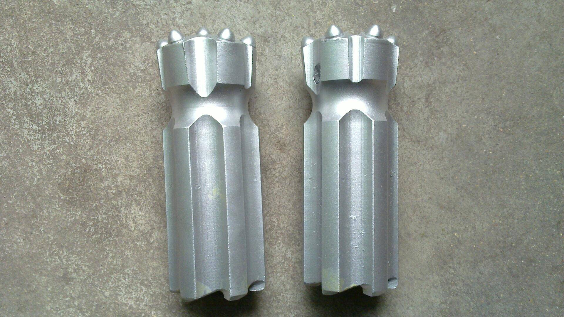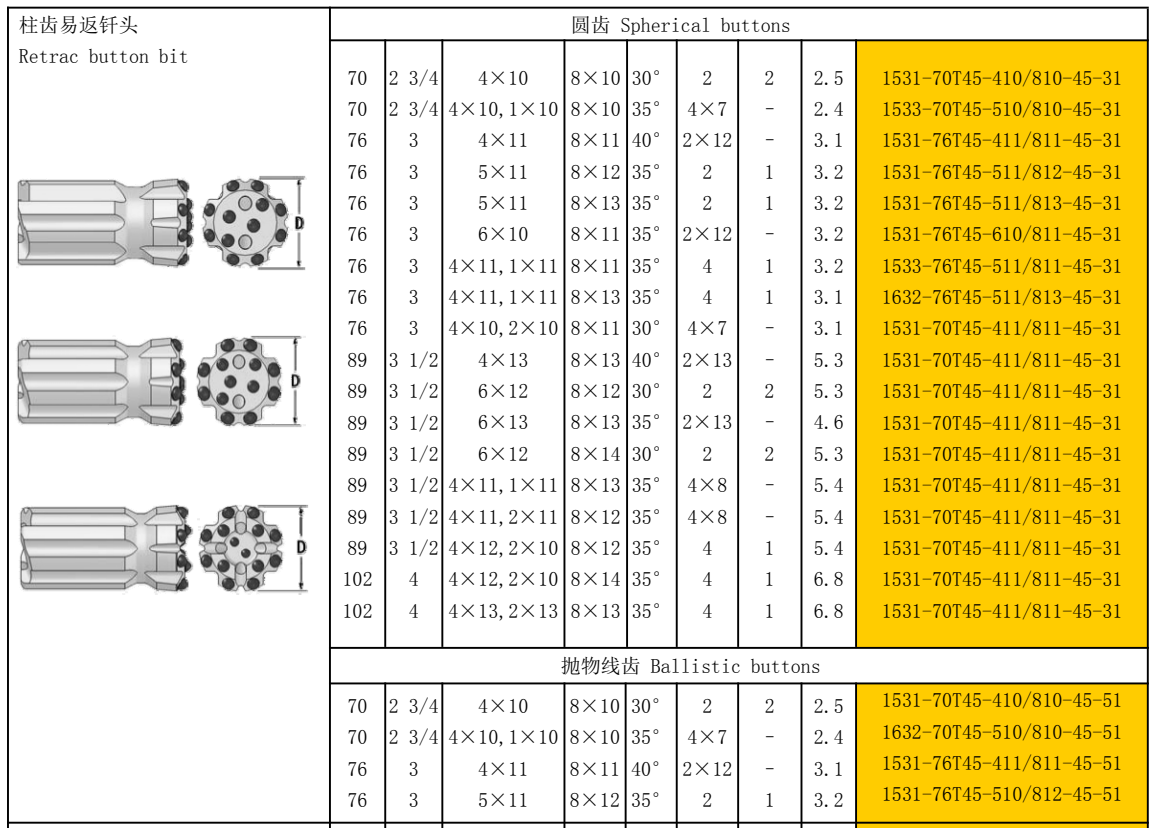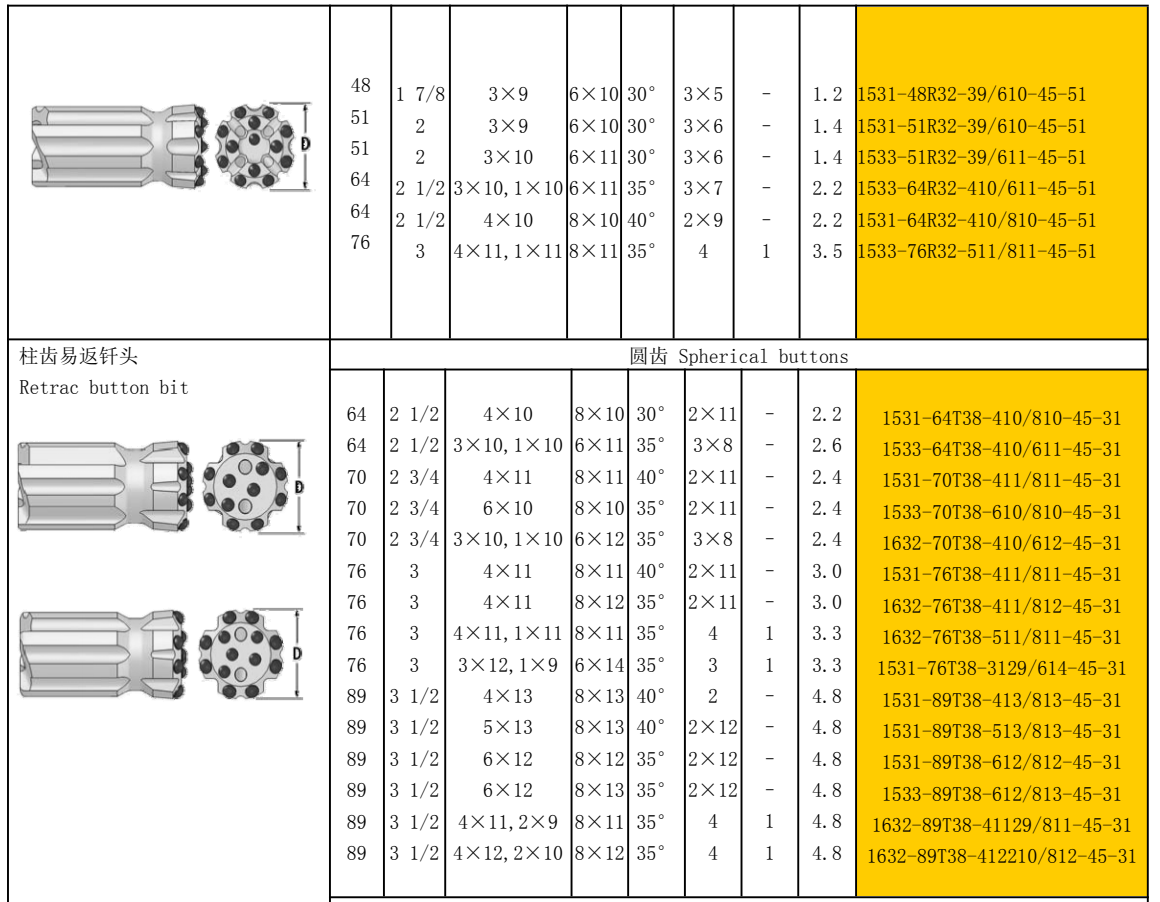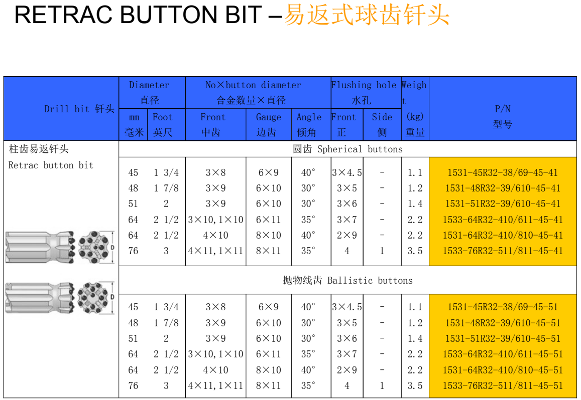 Retrac button bit are made by high quality alloy steel bar and tungsten carbide, through heat treatment to improve products surface hardness to improve the drilling speed , Button Bit designs include; Standard, heavy duty, drop centre, ballistic, parabolic and retract and combination options. Available with all popular international thread forms such as R28, R32, R38, T38, T45, T51 ,T60,ST58,ST68.which can be equipped with rock drilling machines such as Atlas Copco, Boart Longyear, Sandvick, Ingersoll-Rand, Furukawa and so on.