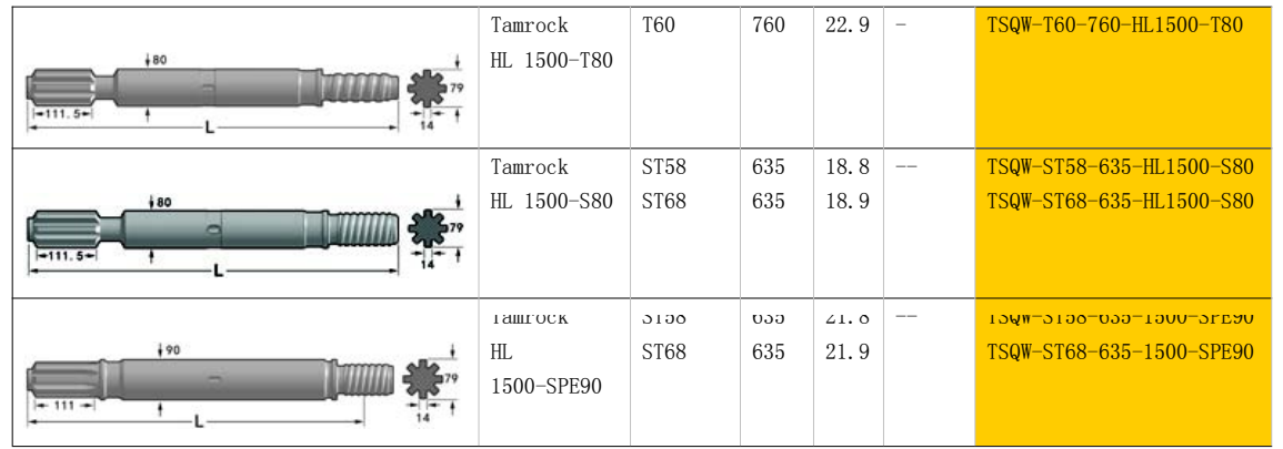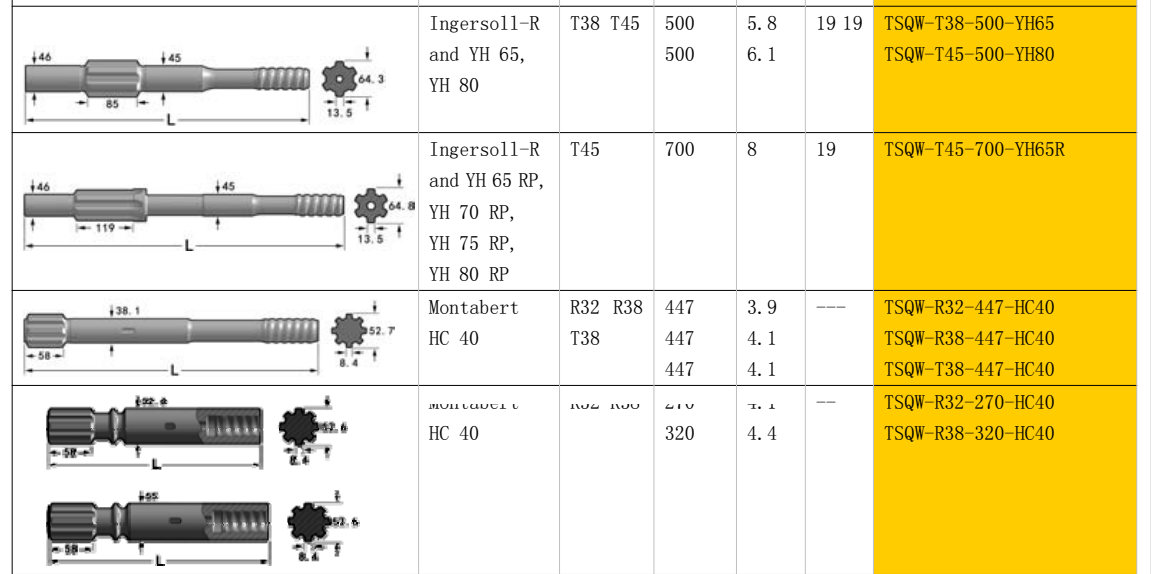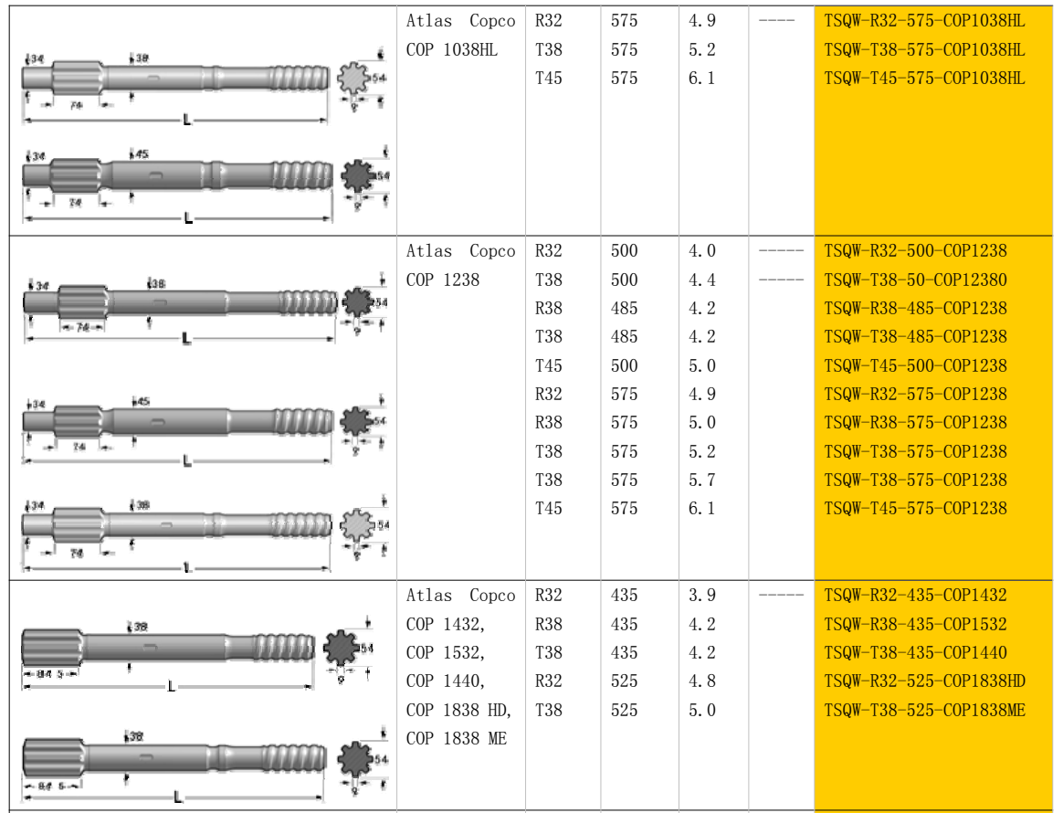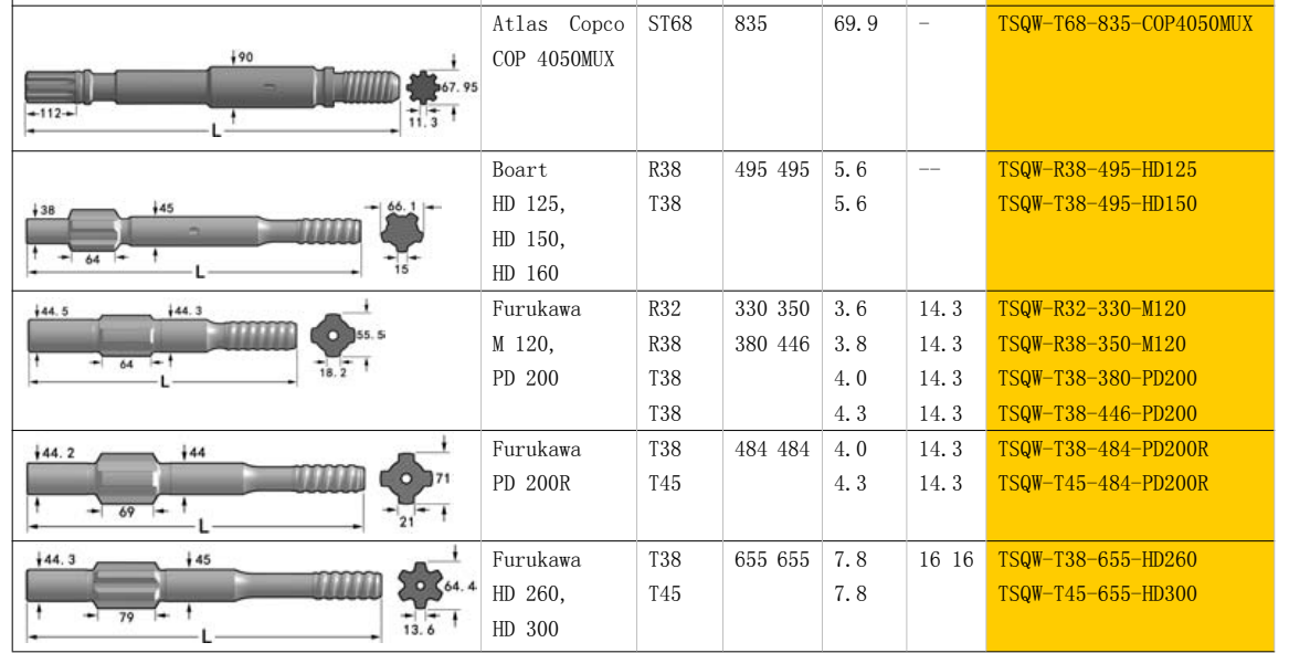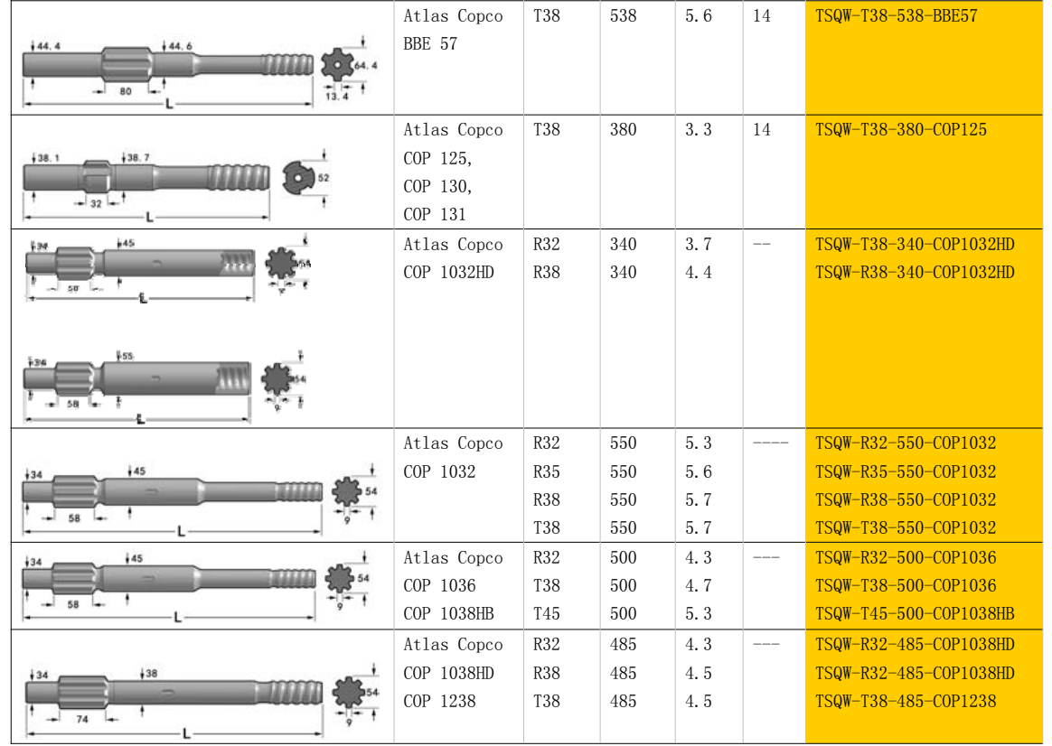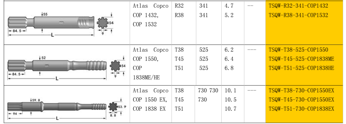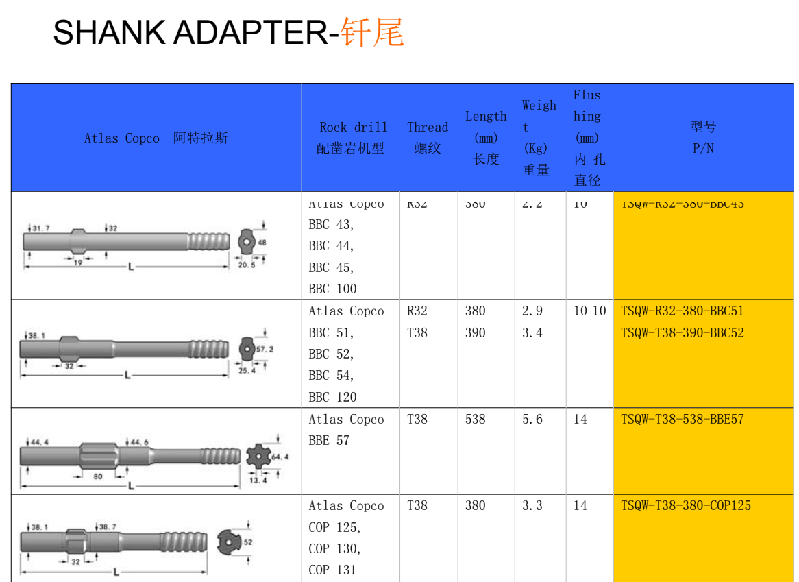 Shank adaptor is used for transmitting power between drill machine and drill stems. One end is to connect drill machine, another end is to connect drill stems, by this way, the power from drill machine is transmitted to drill bits, finally the rocks are cut . shank adapters, couplings, extension rods, threaded cross bits and threaded button bits belong to threaded drilling products. And our shank adaptors are available for,Atlas Copco: COP 1038HL,COP 1238,COP 1432,,COP 1532, COP 1440, COP 1838 HD, COP 1838 etc 。