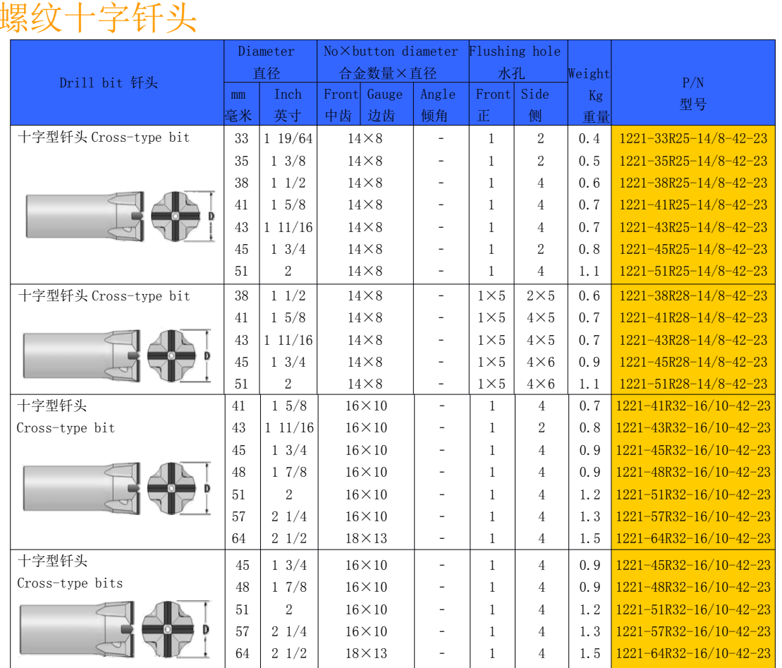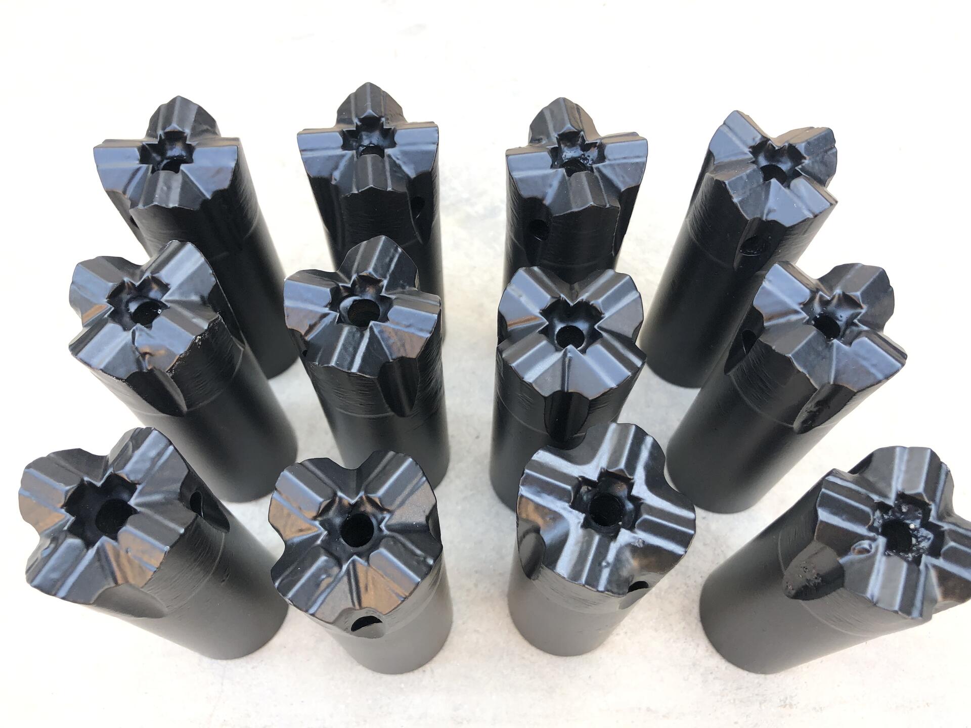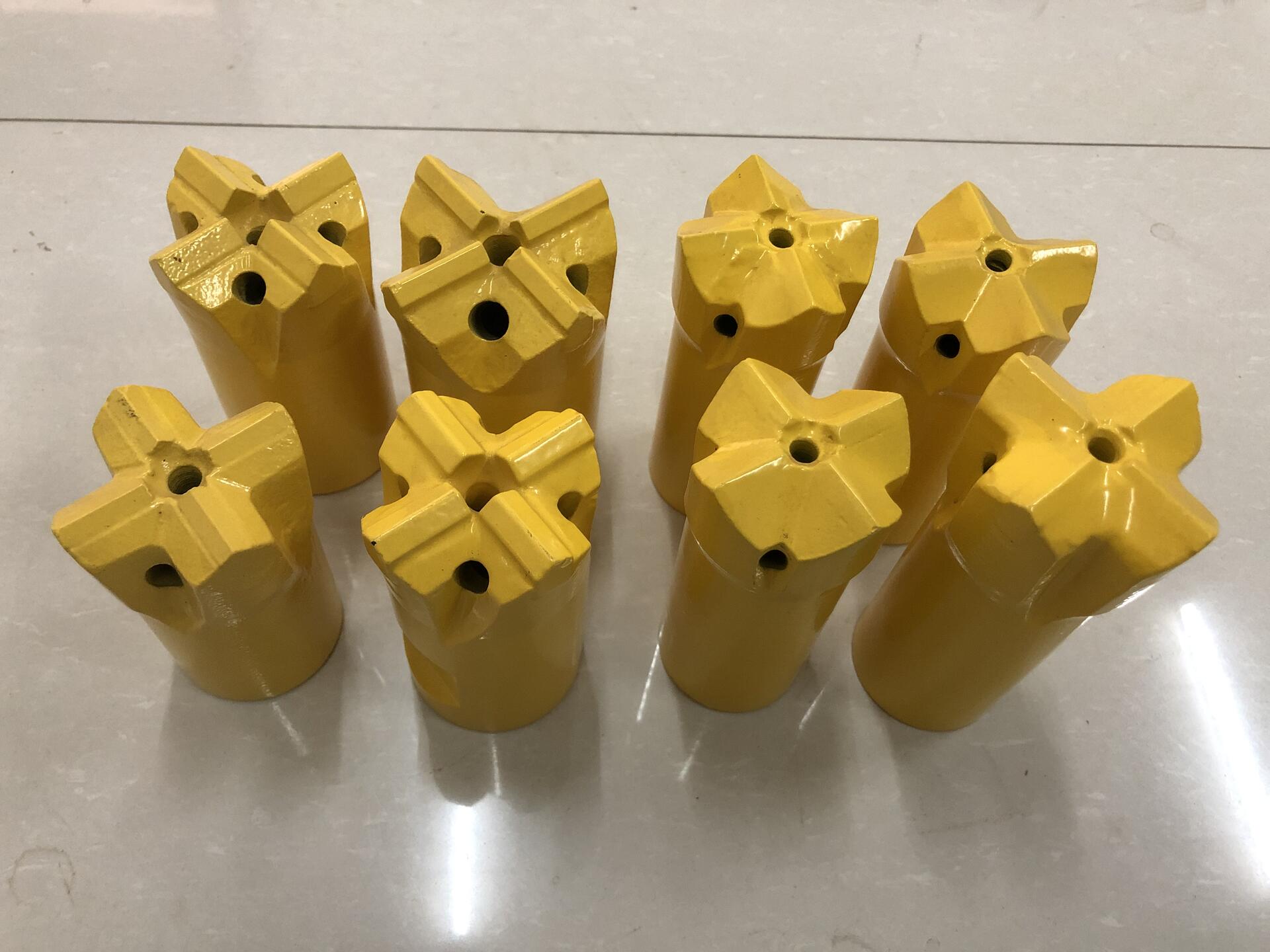 Thread cross bit can be used under any rock drilling condition, it's hardly impacted by the model of drill rig and the rock performance. Generally, chisel bit is mainly used for hard rock, cross bit and button bit are mainly used for fissural rock. It is mainly used for digging into mine laneway and blasting holes in all drilling works matched with the taper drill rod. For different rock, we choose the different alloy to extend the working life of the drill bits.
